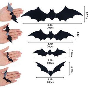Package:120 bats stickers in 4 sizes, enough adhesive tape 20 x big bats 16 x 4 cm, 20 x medium bats 12 x 3 cm, 20 x small bats 8 x 4 cm 60 x small bats 9 x 2 cm