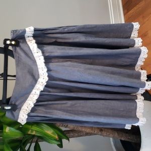 Skirt cotton-chambray gathered broderie anglaise trims ruffled trims fully lined concealed zip fastening along side non-stretchy fabric mid-weight fabric dry clean imported.