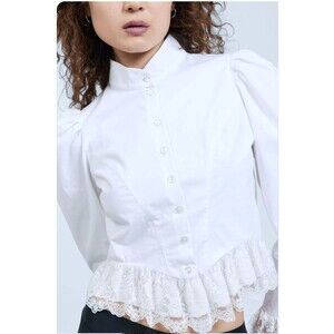 White cotton poplin with gathered puff shoulders and a ruffled lace trim at the cuffs and peplum