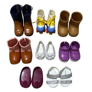 Mixed lot of shoes for 18" dolls including some Battat and Our Generation. Lot includes all eight pair seen in the pictures. Please see pictures and enlarge to show details as they are part of the description. Excellent preowned condition.