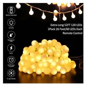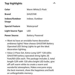 Value 2-Piece Set, Extra-Long 52FT 120 LEDs: GHUSTAR battery operated string lights 26 Feet/60 LEDs each. The package includes 2, total length 52ft with 120 ultra bright LED bulbs, give off soft warm white to create a warm and wonderful atmosphere, Makes everyone enjoy the best moment, share the happiness and built an unforgettable memory.