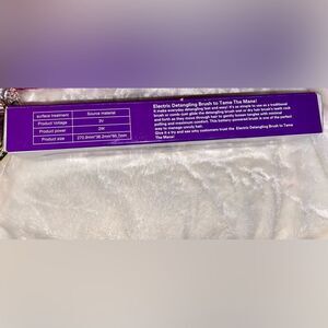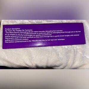 Electric detangling brush. Uses 2 AA batteries. Includes screwdriver to open battery compartment. Good for detangling and head massage. Has a comb dust cover. Good for travel. Only removed from box to take photos.