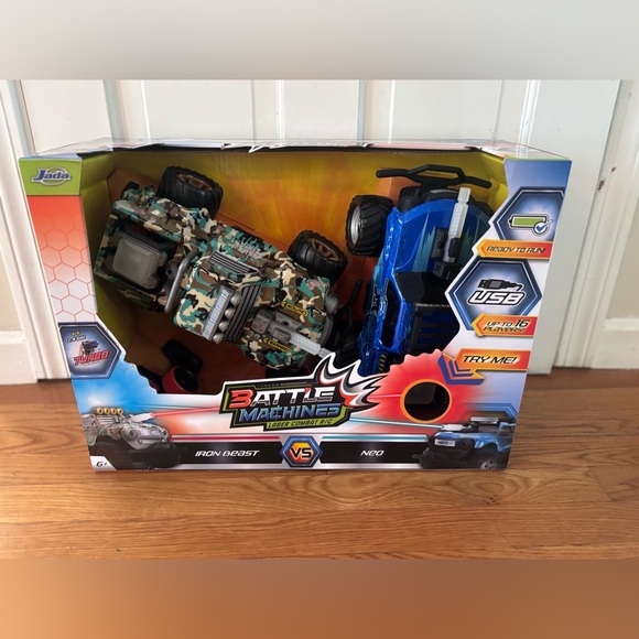 Set of two remote control cars in camouflage and blue. Includes Iron Beast and Neo models. Perfect for racing fun.