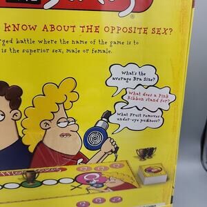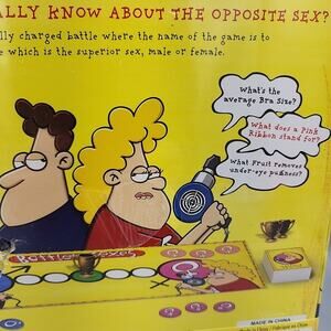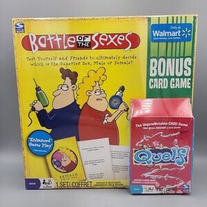 Battle of the Sexes Board Game & Quelf Unpredictable Card Game Sealed 2 Games. Factory sealed. The back of the game has a hole in the box. Thats the only defect. Other than that brand new.