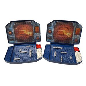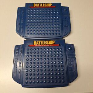 Vintage 2001 Battleship Combat Game pieces feature blue cases, ships, and pegs. No original box included.