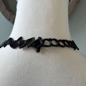 This exquisite black necklace features intricate lace-style patterns with geometric motifs, creating a sophisticated and vintage-inspired look. The collar-style design sits elegantly at the neckline, showcasing delicate cutout details and scalloped edges. Perfect for adding a touch of elegance to any ensemble. Made of vegetable rubber hypoallergenic 100% recyclable No lead, no phthalate no Petroleum. Designed in France responsibly made in China . Like new condition