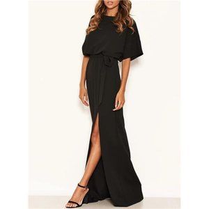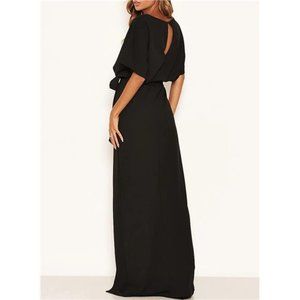 Features: batwing sleeve dress,short sleeve dress,high slit dress,ankle length long maxi dress,waist belt evening gown,keyhole back long dress. Material: elegant high slit batwing sleeve formal maxi dress, made of 95%Polyester+20%Elastane, very light and comfortable to wear. Match: This solid color dress is easy to dress up, perfect with high heel, sandals in spring, summer, autumn, or match with coat or cardigans in winter. Occasions: You can wear this formal long dresses for beach, outdoor, party, cocktail, daily work, holiday, wedding party, club, dating, etc. Washing Instruction: Hand washable, hand wash cold, air dry, no isolating, no bleaching, don't heat dry.