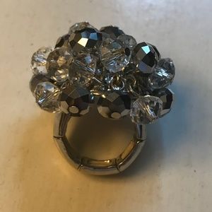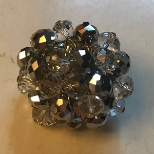 Bauble cocktail ring with beading. It has both clear and shiny silver-grey beads. Self-adjusting ring so you can wear it on any finger! All beads are intact. Fun ring that's in good condition!