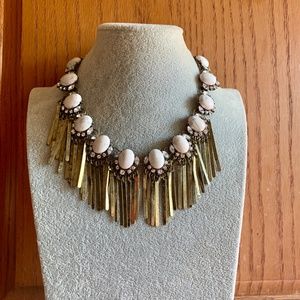 Sparkling crystals, white "marble" acrylic cabochons & antiqued metal fringe.