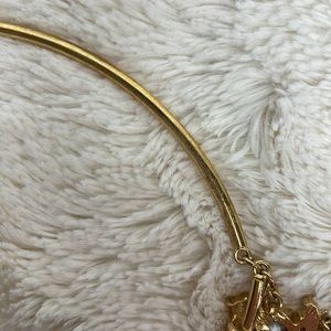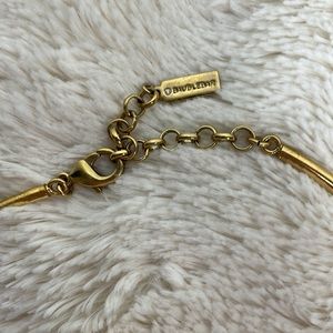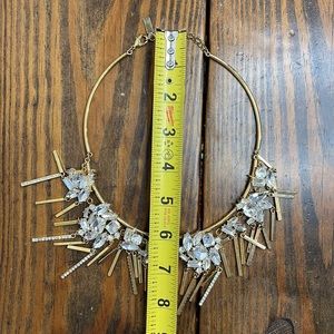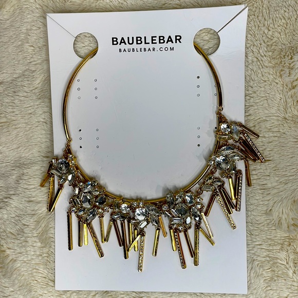 BaubleBar necklace with rhinestones and gold colored chain and details. The necklace has all of the rhinestones. It is a heavier, more substantial necklace, and looks great under button downs or overs a round neck top. The gold details show some wear and I have tried to picture it the best I could. Necklace is adjustable in the back. Will include the cardboard it originally came on.