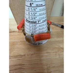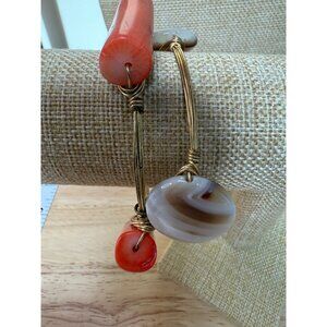 Stylish and versatile set of two bangle bracelets featuring coral and brown stones. Wire-wrapped gold-tone design adds a touch of elegance to your outfit.
