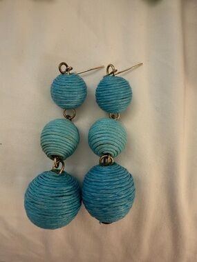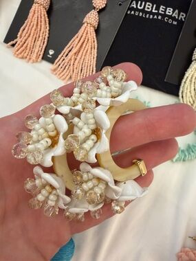 Mixed BaubleBar earring assortment. Includes peach beaded tassels, cream beaded tassels, mint chip hoop pairs, aqua wrapped bead drops, floral peach cluster studs, gold-accented cream hoops, and silver-gray seed bead tassels. Versatile statement pieces for layered looks.