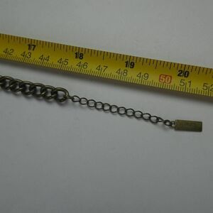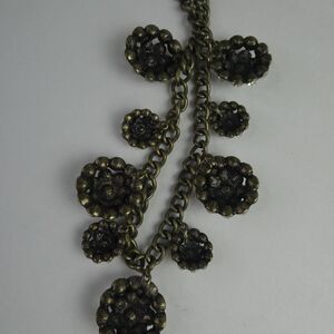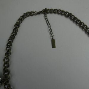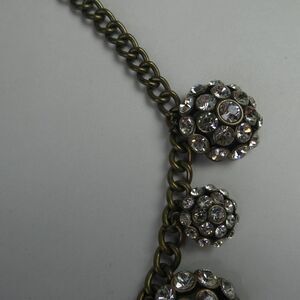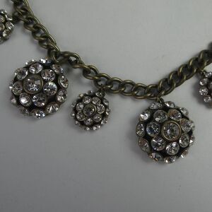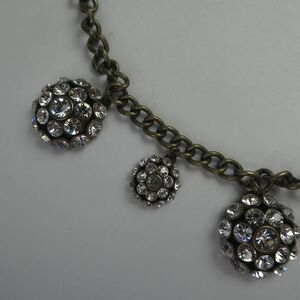 Antique finished chain necklace with various sized dangle elements embellished with clear rhinestones. Adjustable clasp.