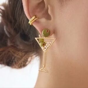 Perfect for a cocktail party or just shaking up your look, these whimsical martini-themed earrings are sure to stir up some lively conversation. 1 7/8" drop; 7/8" width Surgical steel post back Goldtone plate/stone/glass Imported
