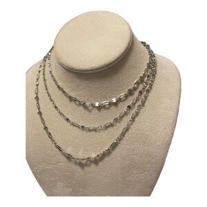 Three strand silver tone necklace. Solid disc and open oval loop link. Choker style or for a young lady 15” at neck. Longest strand hangs a couple inches longer. Lobster clasp. GUC.