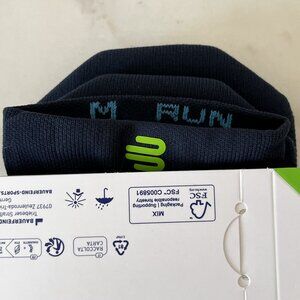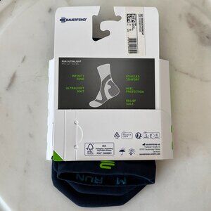 New, unused Bauerfeind Men's Run Ultralight Mid Cut Socks in solid navy blue. Package contains one (1) pair of men's US 10.5-12 (standard size) socks. Product made in Germany.
