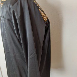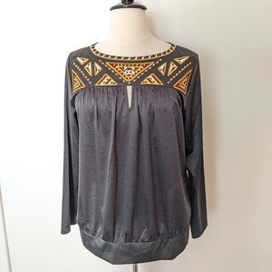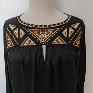 This top has decorative embroidery that reminds me of the 1920s Bauhaus style. Elements of Art Deco and Modernism fused with a romantic fabric drape. Keyhole cut out at the high front. Blouson cut hem. Brand new with tags!