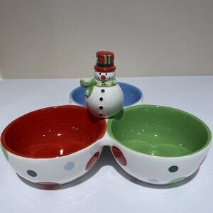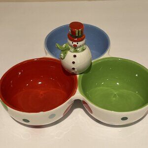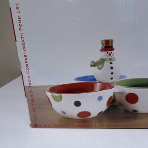 Baum Bros Holiday Condiment Serving Dish 3 Section Snowman Winter Wonderland NEW