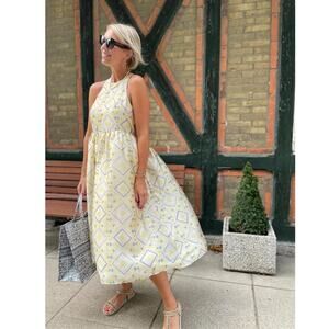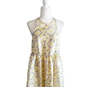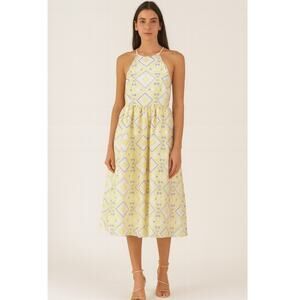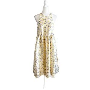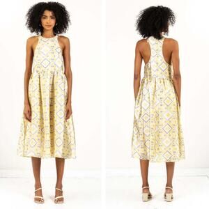 This midi-length dress features a fitted, racerback top and loose, voluminous skirt. There is a zip closure at the back. The Adveda Dress features a tight fit at the top, loose fit at the bottom.