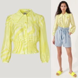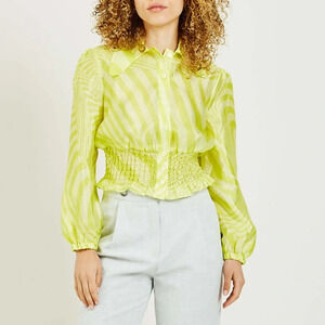 features: abstract pattern print, front button fastening, oversized pointed collar, elasticated panelling, long sleeves, elasticated cuffs, ruffle hem and slim cut