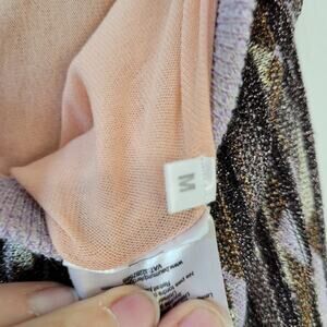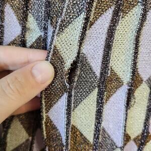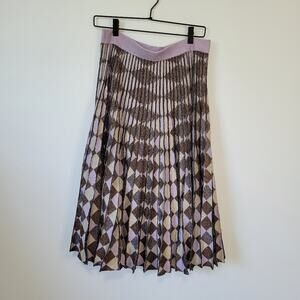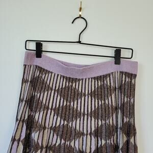 Features: Purple printed lurex (50% Oragnic Cotton, 50% Polyester). Skirt. Elastic waistband. Partially lined. 29" from waist to hemline.