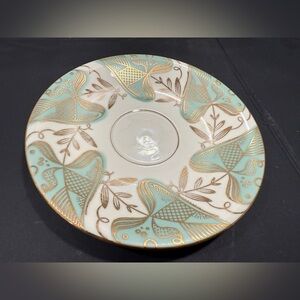 The Bavaria Eberthal Bone China Green & Gold Gilt Floral Leaf Tea Cup & Saucer is a vintage set from Germany, dating back to the 1950s. This elegant tea cup and saucer set features a beautiful floral leaf pattern in gold on bone china, making it a charming addition to any tea-drinking collection. The set includes a decorated handle, adding a touch of luxury to the traditional design. Perfect for collectors of fine dinnerware or those looking to add a touch of vintage charm to their tea-drinking experience.