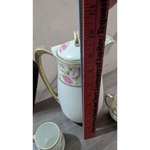 Pre-owned in good condition, slight wear on gold trim. No cracks or chips. Measurements: Pitcher height = 9 inches, cup height = 2.5 inches.
