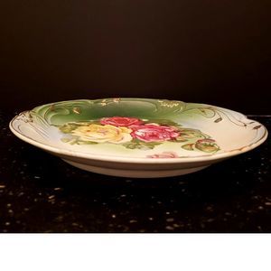 Beautiful large plate or round platter. Decorated with pink and yellow roses, gold scrolls and embossed. No maker's mark