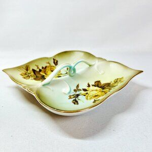 This stunning dish produced by Porzellanfabrik Passau GmbH, a German porcelain manufacturer located in Passau, Bavaria. This unique dish features transfers of yellow roses and brown leaves against a light green background with raised embellishments. A teal twisted applied handle and accented with a gilded rim give an elegant feel.