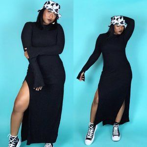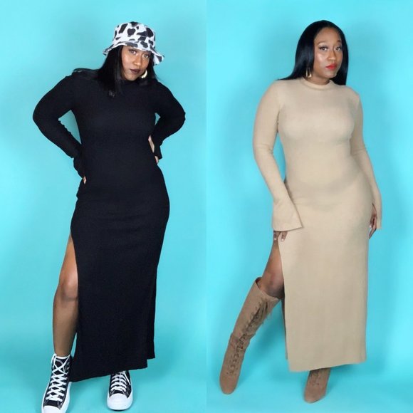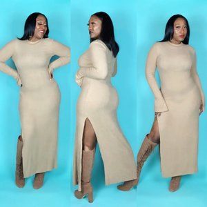 Long sleeve, crew neck, ribbed body-con maxi, cashmere dress with splits. Bell sleeves also have splits. (Model wearing a large)