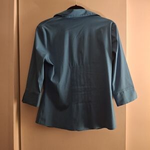 This elegant top from Bay Studio showcases a notched collar and pleated front, adding a touch of sophistication to your wardrobe. The 3/4 sleeves and button-down design make it ideal for a business casual setting. Available in a refreshing blue, this shirt combines style and versatility effortlessly. Size PM. pit to pit measures 17-1/2 inches. Length 24 inches.