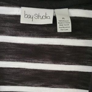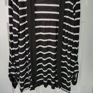 Lightweight and versatile, this black and white striped open front rayon cardigan has turned-up ruched sleeves.