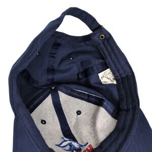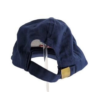 Features: Front embroidered "Bay of Fundy Digby, N.S." with a whale's tail, 100% cotton, navy blue, 6 panel, adjustable brass clip strap, slightly curved visor, made by Victory Caps of Toronto Canada.