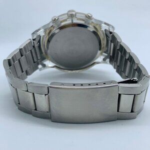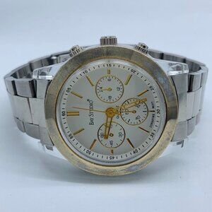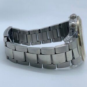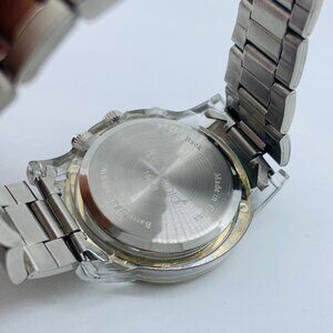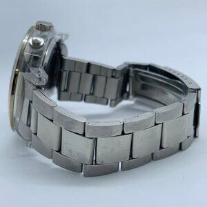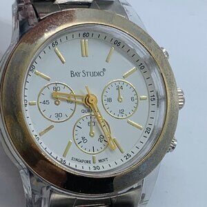 Bay studio men watch 38mm clear plastic case Quartz analog gold tone bezel silver tone adjustable bracelet size up to 7.5” , in good condition running