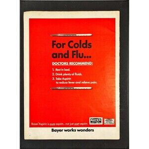 Bayer Aspiran "For Colds and Flu: reduce fever and pain" Vintage Print Ad 1966 Life Magazine February 4,1966 About 10.5 x 14 Inches. Carefully shipped.
