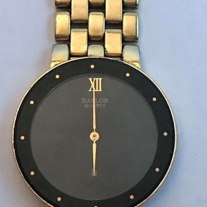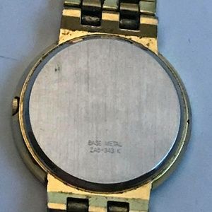 Black face with gold band. Nice looking watch in good condition. Works perfect.