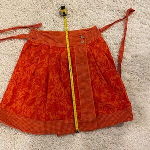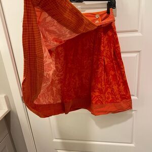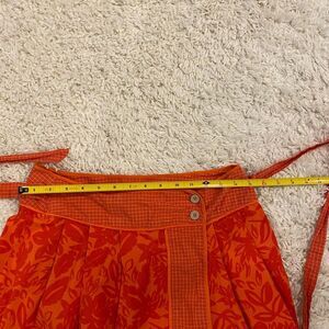 Bayo Wrap Skirt. Orange. SZ 31 (Medium). Wrap Skirt. 2 Side Buttons for Closure. Ties at the front or side. Tropical Print. Unlined. Hand Wash. Hang Dry.