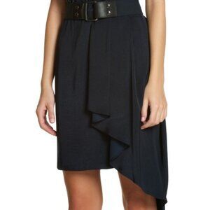 CARBON Blue. Very elegant dress with edgy studded details. Round neck. Cap sleeves. Studded front details. Draped construction. Asymmetrical skirt at side waist. Elastic belt included. Concealed center back zipper with hook-and-eye closure.