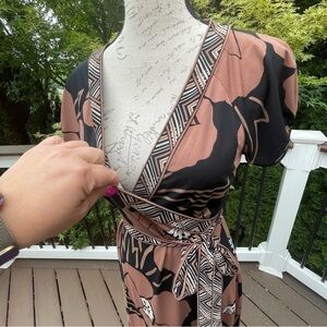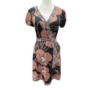 Bcbg MAXAZRIA $300 Black Brown Floral Belted Wrap Dress knee length Sz M