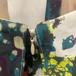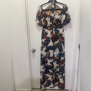 Gorgeous halter dress with off shoulder sleeves. Elegant and chic. Back hidden zipper with clasp and front knee length slit.