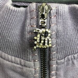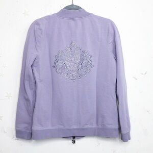 BCBG Max Azria lavender embellish zip up jacket, 95% cotton 5% spandex good condition gently preowned just a few rhinestones missing from the zipper logo as shown in one image.