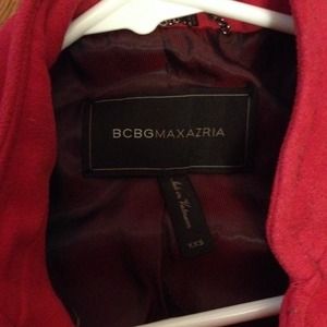 Xs very fitted bcbg maxazria red jacket. I bought it from macys almost 2 years ago i have never worn but it has been washed. The tags were in the pocket but it got wet when i washed it.