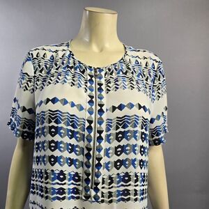 Stylish dress with a blue and white pattern. Features a unique design and short sleeves.
