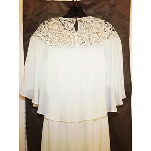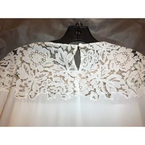 White bcbg dress with cape overlay and lace skirt hem.worn once.it is size xxs and it fits me perfectly though I usually wear size s in other brands.worn only once,looks like new,no stains,no odor.comes in an original dust case