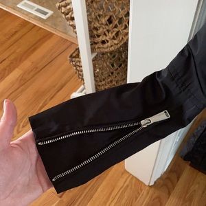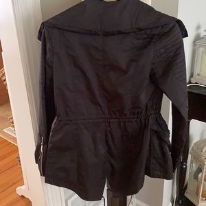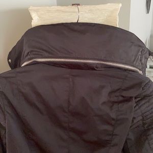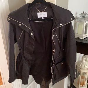 Bcbg generation black spring/fall jacket with silver zipper in the front and arms. Adjustable waist has not been worn as it is too small tags have been removed. Size XS hidden hood in the back.