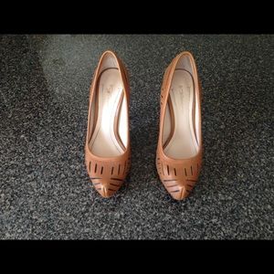 Tan and black BCBG gently used pumps. Worn maybe 5 times. Slight scuff on toe and back of heel. Size 6