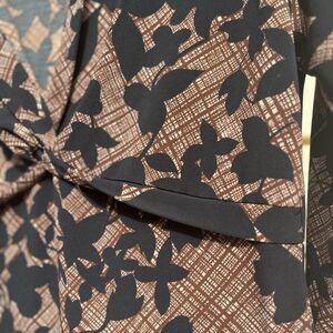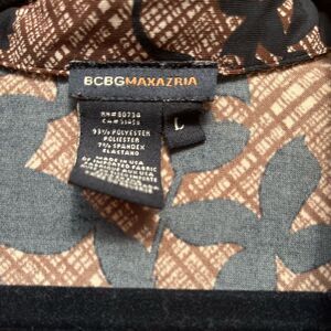 The BCBGMaxAzria blouse is a sophisticated piece featuring a brown and black pattern. With long sleeves, a collared v-neck design, and a stretchy fit, it exudes both elegance and comfort. Size Large but looks good on Medium frame also due to stretchy material. Great condition.