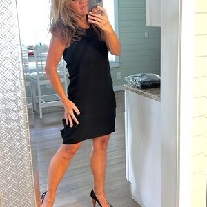 Eren, BLACK sleeveless round neck cutout shift dress with round/scoop neckline, draped cutout/ladder/lattice details at bodice sides, relaxed silhouette/draped fit, and straight hemline, excellent condition