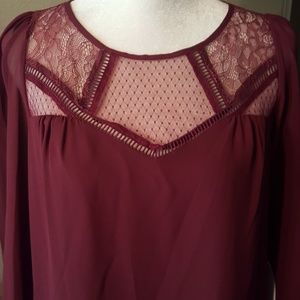 Round neckline. Long sleeves, floral lace cuffs. Floral lace yoke with dotted mesh panels and gathering at seam. Keyhole at back. Lined bodice. Hits above the knee. Self: Polyester chiffon. Contrast 1: Nylon lace. 2: Nylon mesh. Lining: Polyester.