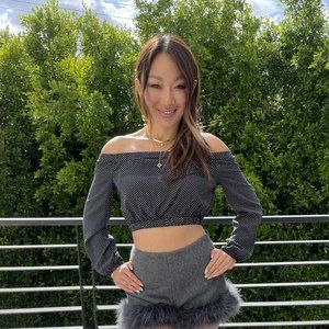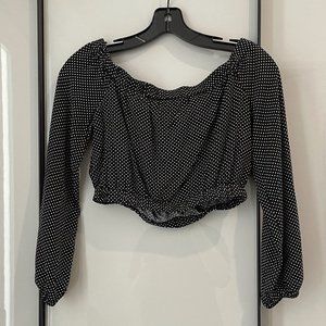 BCBGeneration black and white polka dot long sleeve crop top. Elastic neck-line, waist, and cuffs. Cut out triangle back.